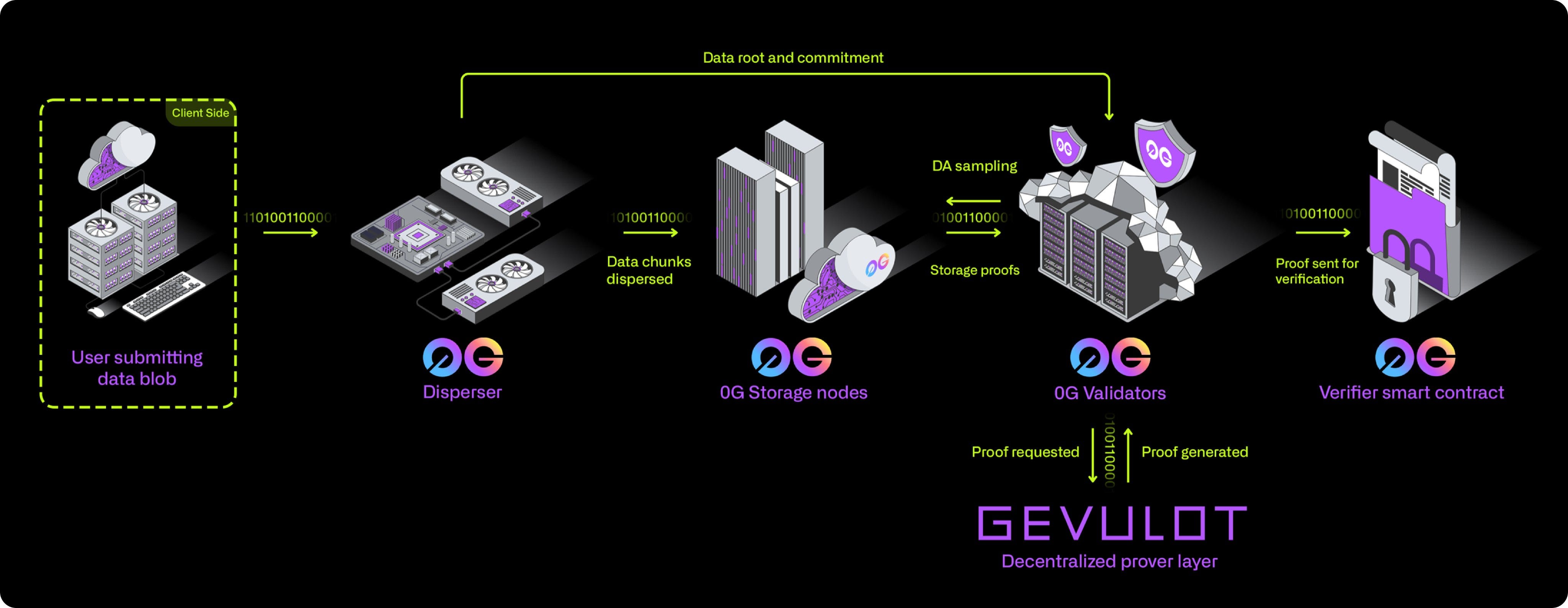 Storage Proofs: 0G Storage nodes (also called miners) submit storage proofs for the data, while 0G Validators request a proof from Gevulot,