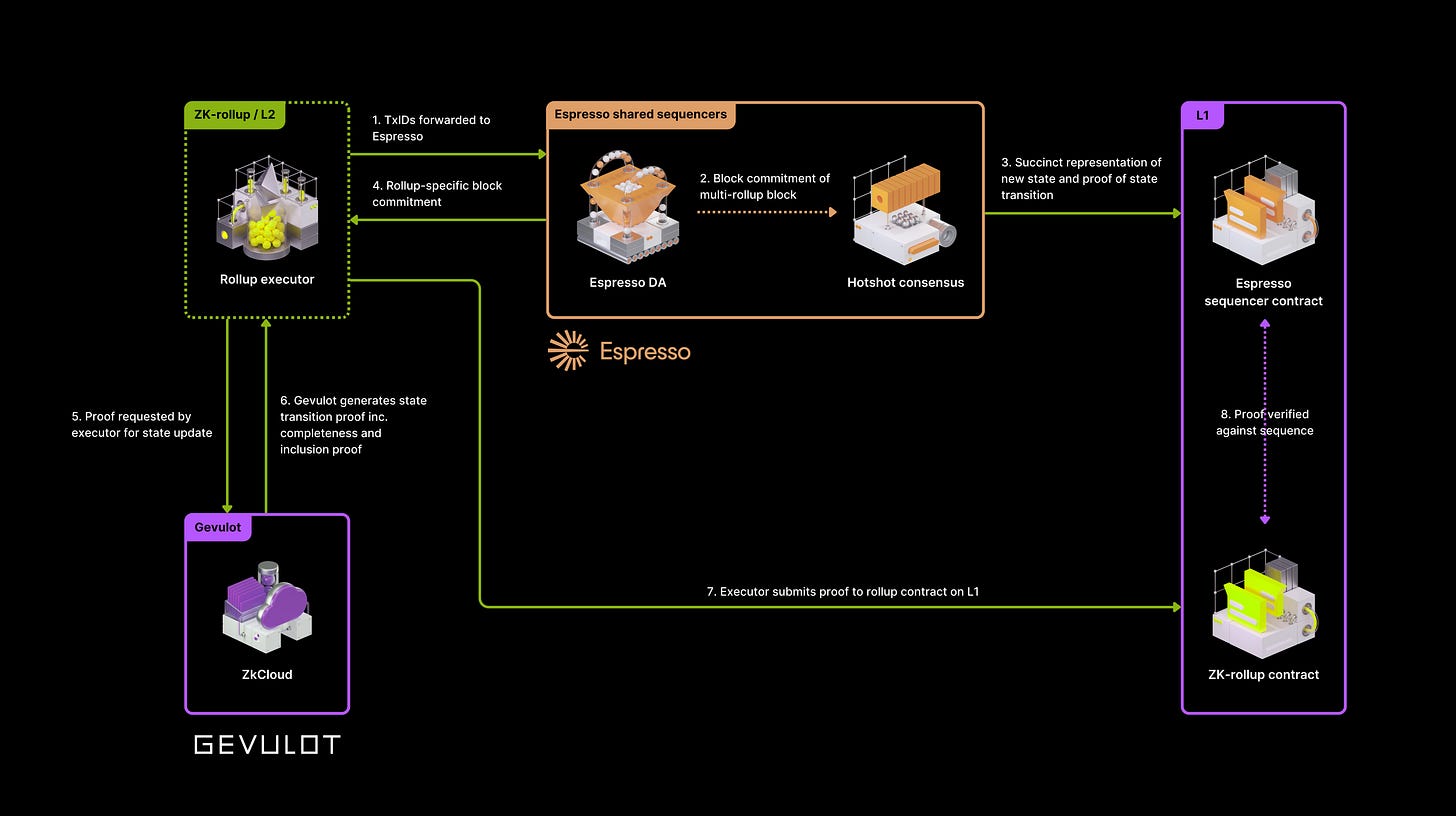 Espresso and Gevulot are poised to promote a credibly neutral future for the modular stack combatting monolithic, siloed, and centralized designs. With Espresso focused on the decentralization of the sequencer, Gevulot is becoming the premier shared prover layer for value-aligned partners in the zk rollup stack. Both offer vital layers to collect transactions from various modular rollup chains and consolidate them for execution. Packaging these two solutions together streamlines the flow from sequencing to proving/verifying to DA, creating more cost-effective and secure rollups.