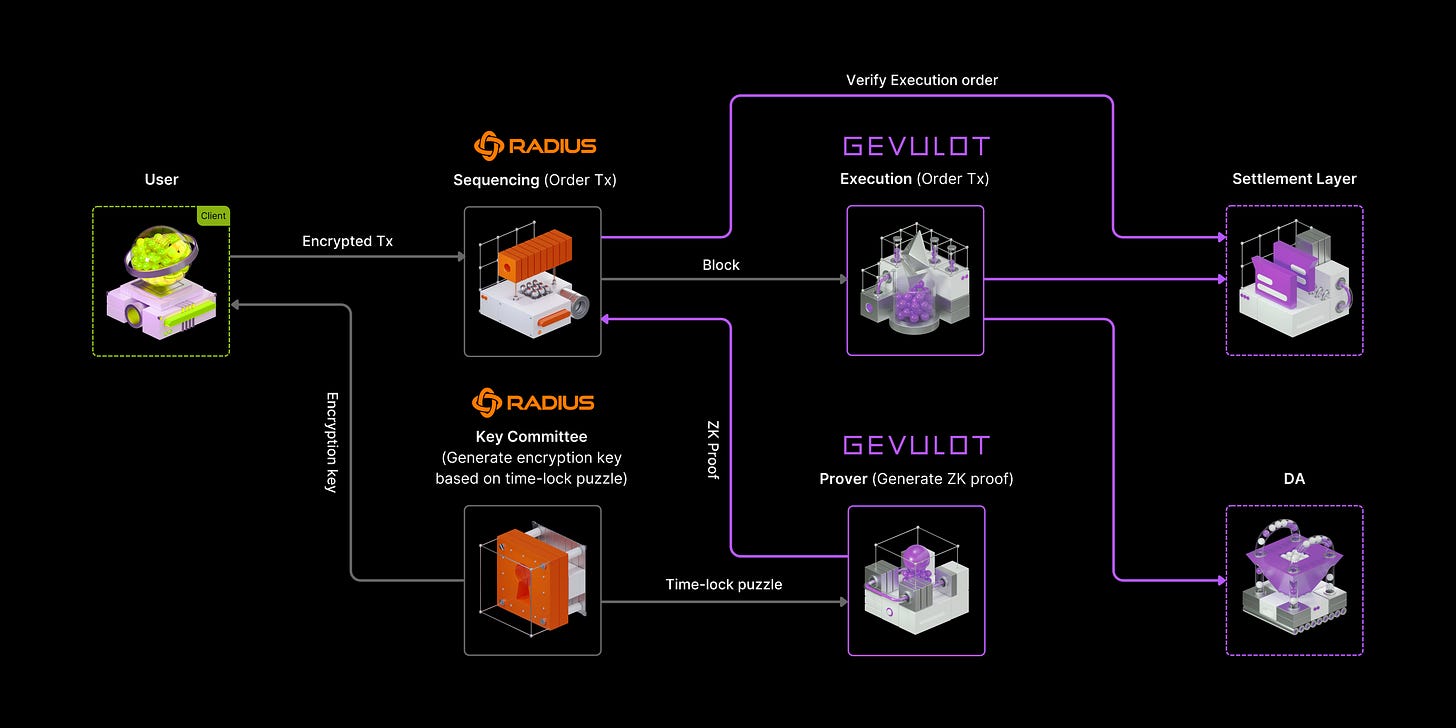 We're excited to announce our partnership with Radius, a sequencing layer designed to secure transactions, guarantee fast finality, and streamline interoperability in rollups. It uses cryptographic algorithms and ZKP for SKDE (Single Key Delay Encryption), an advanced cryptography and ZK-based scheme. It ensures that the transaction ordering process is trustless, preventing centralized sequencers from engaging in frontrunning, sandwiching, and censoring transactions. Radius is to sequencing what Gevulot is to proving. By integrating both, L2s and rollups can significantly lower overhead costs.